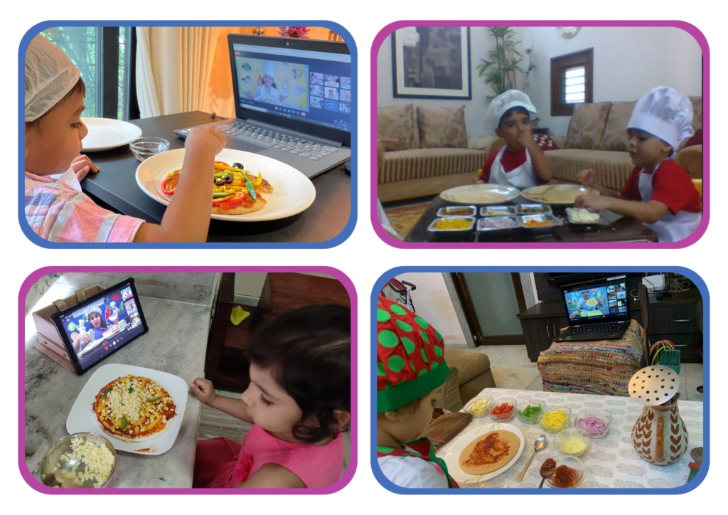 Our toddlers went a step further to put together a healthy pizza by using ingredients like a wheat pizza base, exotic vegetables like bell peppers, olives, onions and corn.